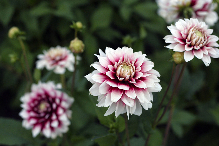 Цветы георгины Сидлер Штольце яркие и крупные, до 13 см в диаметре. У них ярко-бордовая сердцевина, от которой отходят одиночные плоские лепестки с плавным переходом цвета к белому. Цветы полностью махровые и немного отогнуты к стеблю — эта особенность делает соцветия очень пышными.