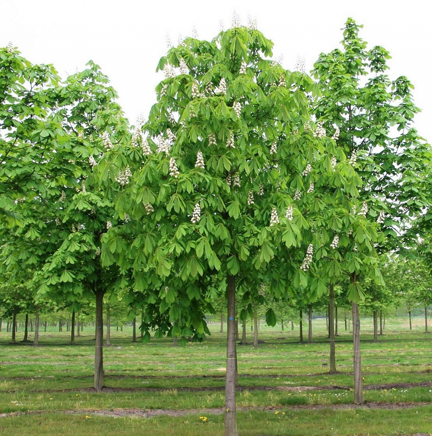 Саженцы каштана конского – великолепный сорт деревьев с густой широкой кроной и обильным декоративным цветением. Форма кроны округлая и широкая, в период цветения усыпана крупными пирамидальными свечами из соцветий. Крупные красивые листья имеют пальчатую форму, по 5 отдельных листов в каждом веере. После цветения образуются крупные, зеленые с шипами коробки плодов, внутри которых зреют коричневые глянцевые семена. Взрослый крупномер дорастает до 25 м высоту. Каштан конский является ценным медоносом и лекарственным растением.