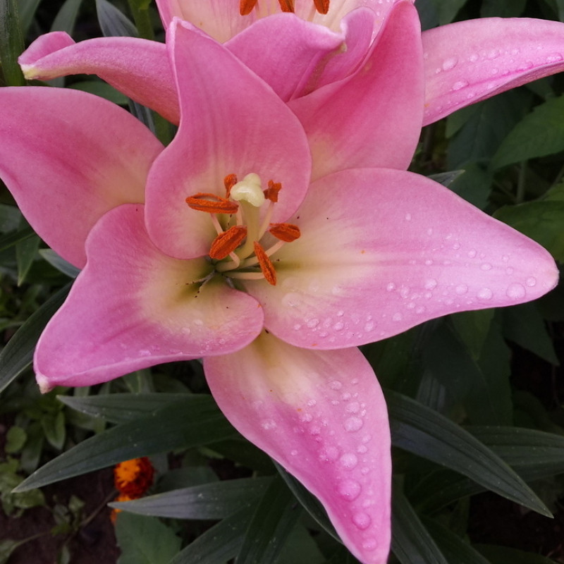Окраска цветка : Перламутрово-розовая с белым центром, темно-розовые пыльники и редкий мелкий крап у основания
