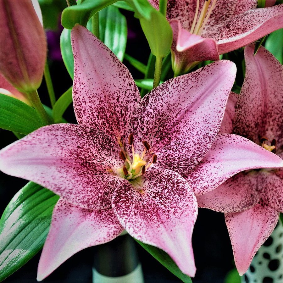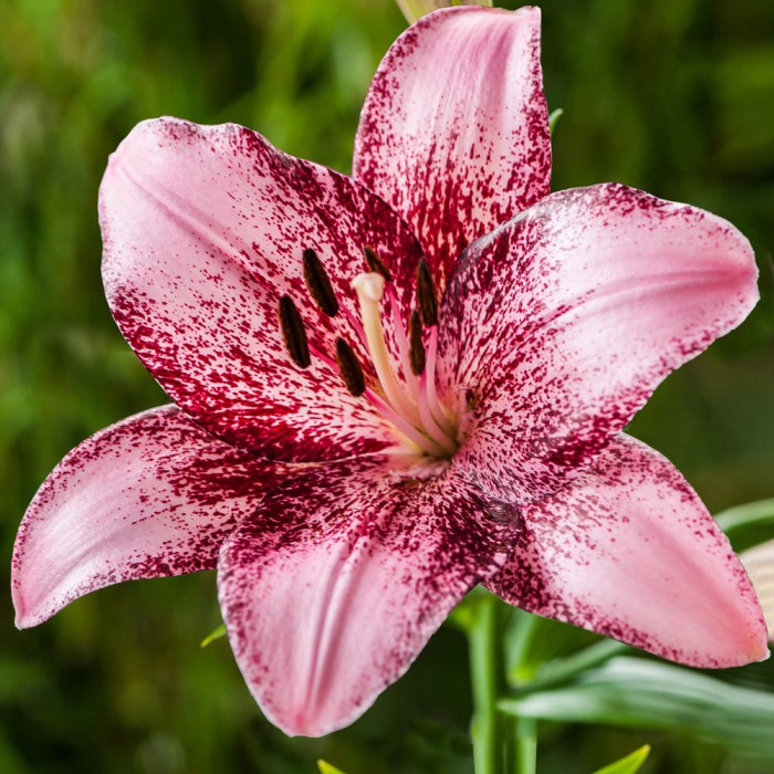 • Окраска цветка : крупный, перламутрово-розовый с редким бордовым напылением по краям лепестков и у центра, пыльники темные