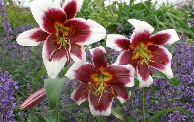 Лилия от-гибрид Мисс Лили - это великолепное растение с белыми цветками, украшенными темно-красным пятном. Ее стебель достигает высоты до 120 см, а размер цветка может достигать до 30 см. Листья лилии имеют зеленую окраску и интересную форму. Это растение предпочитает солнечные и полутенистые места для посадки, идеально подходит для газонов, групповых и одиночных посадок.