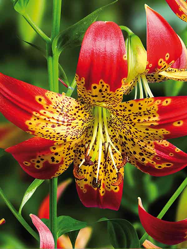 Окраска цветка : ярко-жёлтый с крупным частым тёмно-бордовым крапом и красно-оранжевыми кончиками