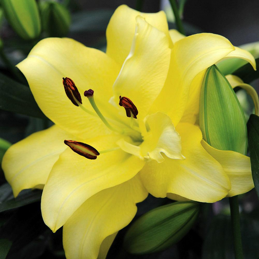 Луковицы лилии восточной махровой Экзотик Сан (Lilium Exotic Sun) — солнечное украшение любого сада или букета. Сорт запоминается своими крупными (до 20 см в диаметре) цветами насыщенного желтого оттенка. Лепестки однотонные, очень широкие и махровые, с ажурными краями. Они распускаются в конце лета, очень пышные и ароматные. Взрослое растение достигает 100 см в высоту. Лилии могут находиться в открытом грунте в течение всего года, при этом их не нужно пересаживать минимум 3–5 лет. В течение лета их достаточно поливать и подкармливать, а на зиму — укрыть от морозов. Цветущие стебли стоит срезать для букетов — они очень прочные и долго не увядают в вазонах.