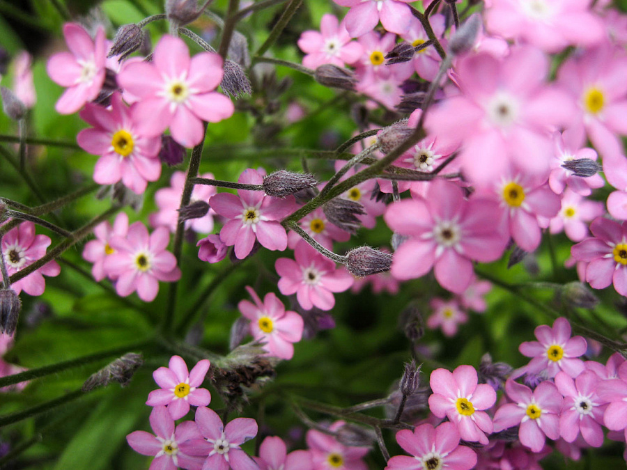Семена незабудки садовой отлично приживаются, как на солнечных, так и на тенистых участках. Это растение будет радовать садоводов цветением, во время которого на ветвях появляются нежные розовые соцветия. Данный экземпляр можно размещать где угодно: