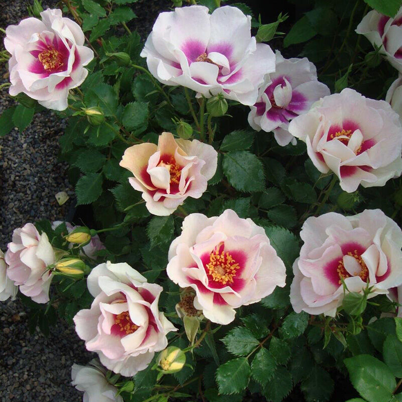 Роза парковая Bulls Eye - это великолепное растение с кремовыми цветами, украшенными ярко-фиолетовым или клюквенно-красным пятном в центре. Этот сорт розы, созданный оригинатором Питером Джеймсом в Великобритании в 2011 году, поражает своей красотой и изяществом. Роза Bulls Eye достигает высоты до 120-160 см и цветет в июле, августе, сентябре и октябре, радуя глаз своими прекрасными цветами.