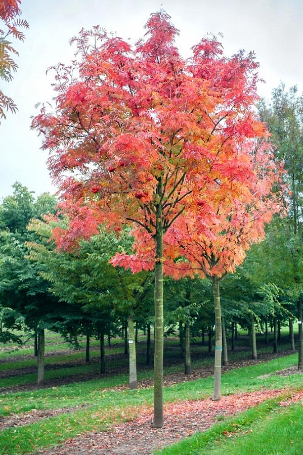 Дерево раскидистое, с ажурной кроной, достигает до 8 метров в высоту. Листья длинные – около 20 сантиметров в длину, непарноперистые. Состоят из множества узких ланцетовидных листочков, которые придают дереву экзотический вид. Цветет данный сорт рябины в конце мая. Ягоды крупные, красно-оранжевого оттенка, грушевидной формы.
