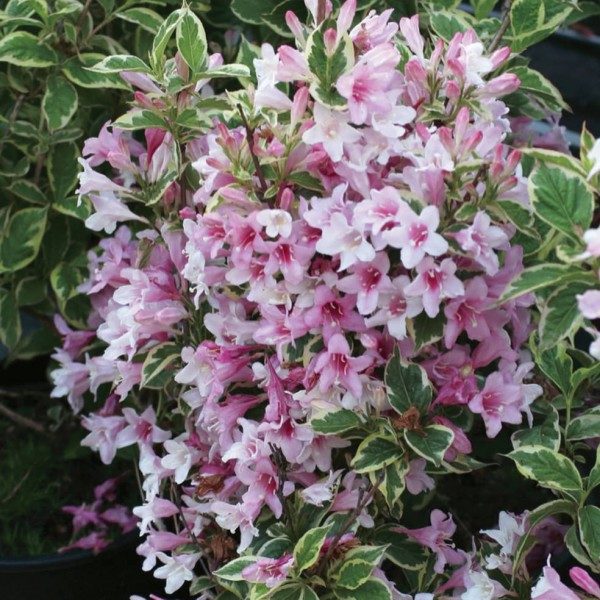 Саженцы вейгелы цветущей Нана Вариегата (Nana Variegata) придутся кстати для множества композиционных решений — от одиночных высадок до контрастных композиций, хорошо смотрятся на фоне ухоженной газонной травы. Кустарник поднимается до полутора метров вверх, разрастаясь на 2 метра в диаметре. Листья — одна из декоративных составляющих этого растения: ярко-зелёный основной окрас со светло-кремовой каёмкой. Цветы появляются в мае-июле — крупные, трубчато-колокольчатой формы, от светло-розового до розово-фиолетового оттенков. Возможна покупка крупномера вейгелы цветущей Нана Вариегата.